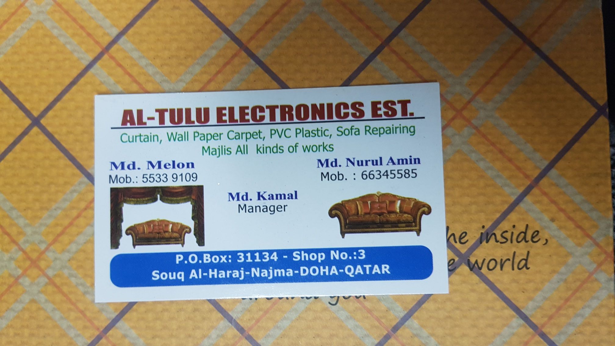 No DescriptionP. V. C Sale Carpet, wallpepar sale and fitting.sofa, arabia majlis making, new curtain making and fitting.sofa Repairang call me= 33984