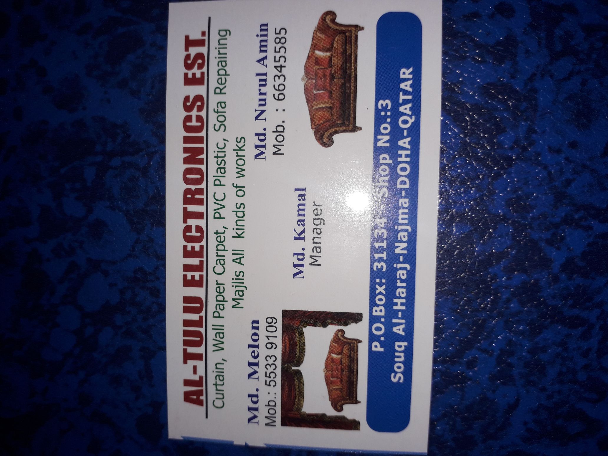 curtain, wallpaper, carpet, pvc plastic,sofa repairing, majlis all kinds of works. Call 66345585